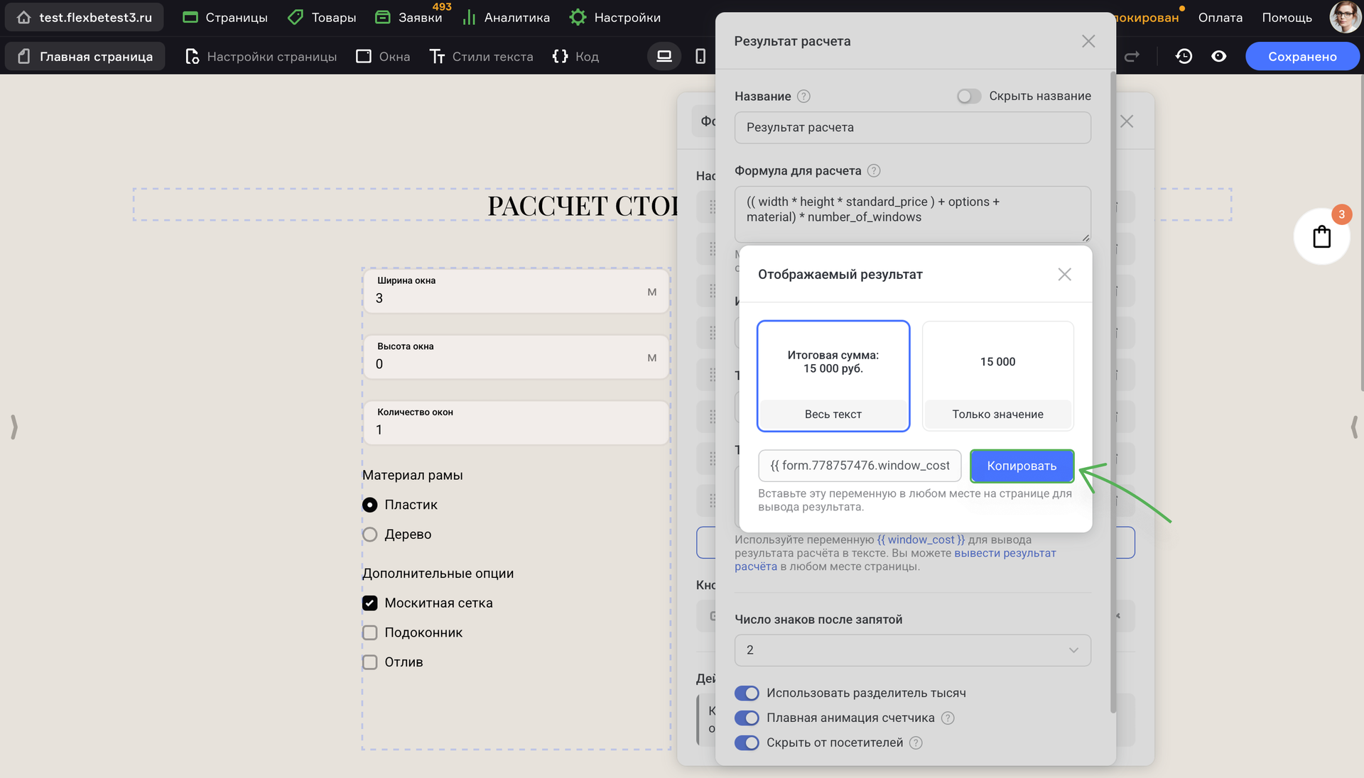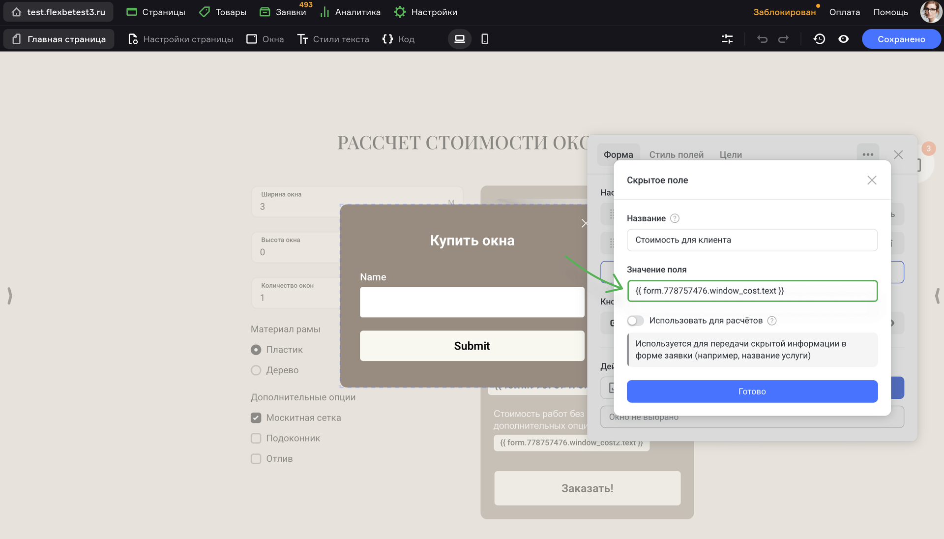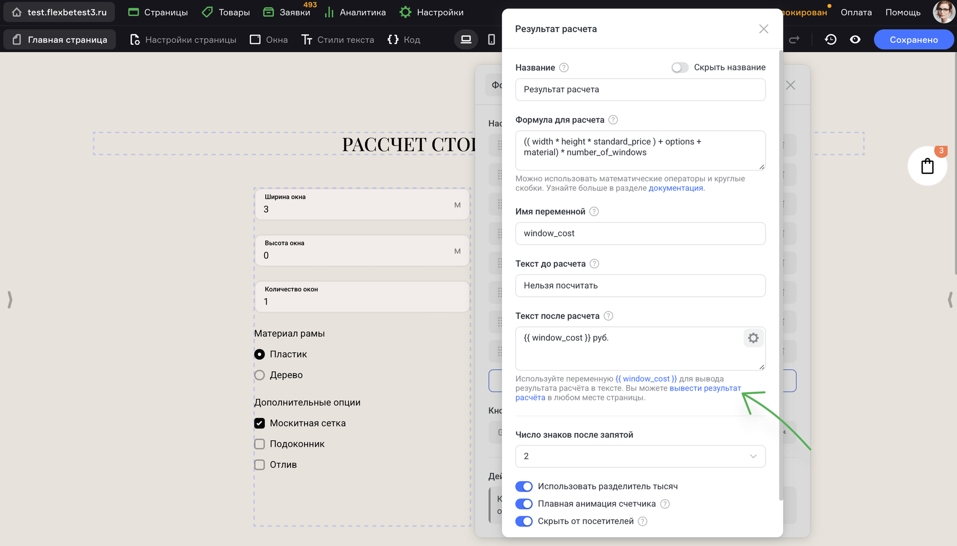 Теперь калькулятор отображает расчет стоимости окна в реальном времени, используя данные, которые ввел клиент.